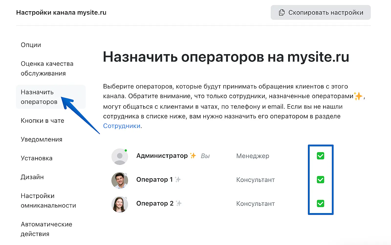 Выберите пункт "Назначить операторов" и отметьте галочкой сотрудников, которые будут получать сообщения с сайта.