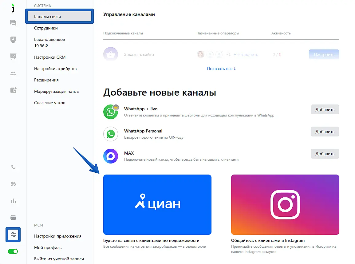 Для настройки интеграции перейдите в приложение Jivo, раздел "Управление" - "Каналы связи".