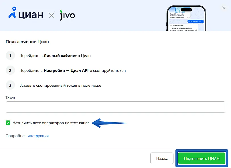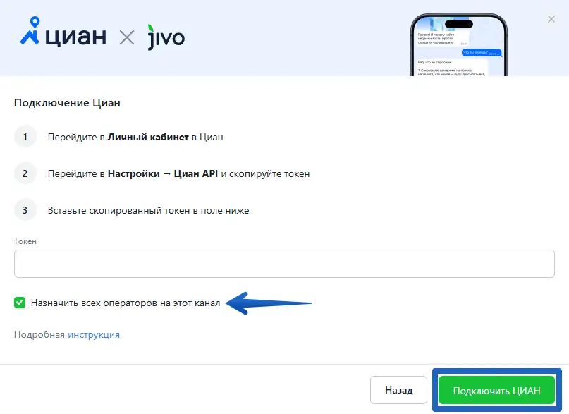 Вставьте его в поле "Токен" в приложении Jivo и нажмите "Подключить ЦИАН".