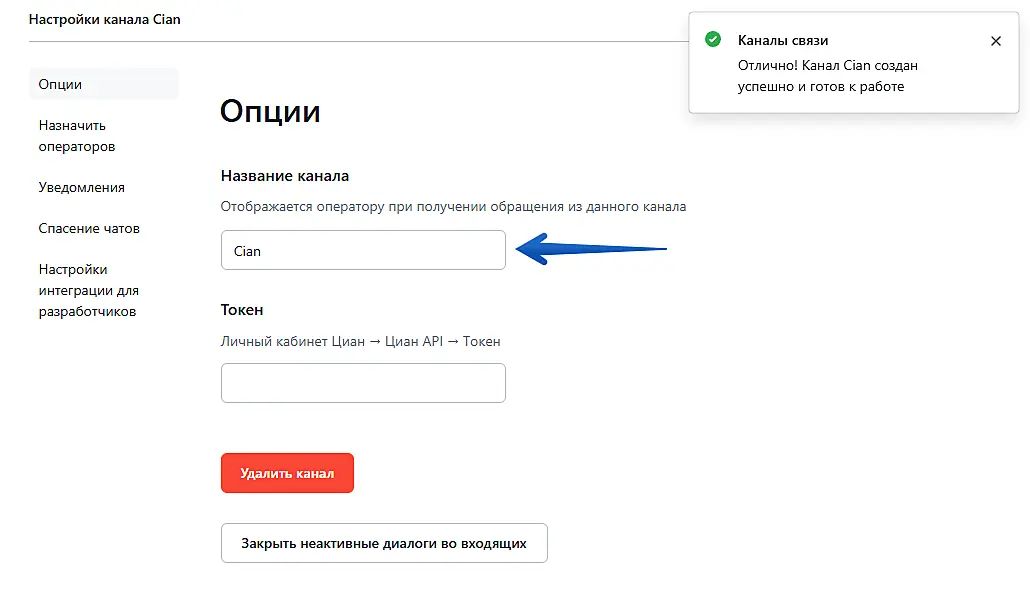 При успешной интеграции вы увидите уведомление в правом верхнем углу, что канал создан и готов к работе.