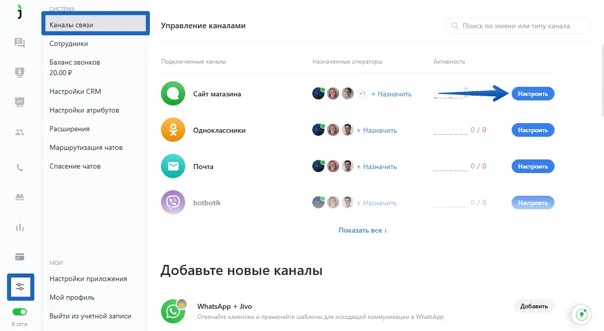 Для этого перейдите в приложение Jivo, в раздел "Управление" > "Каналы связи" > "Настроить" справа от нужного канала.