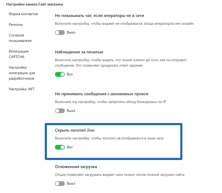Прокрутите страницу вниз, до пункта "Скрыть логотип Jivo" и включите эту настройку.