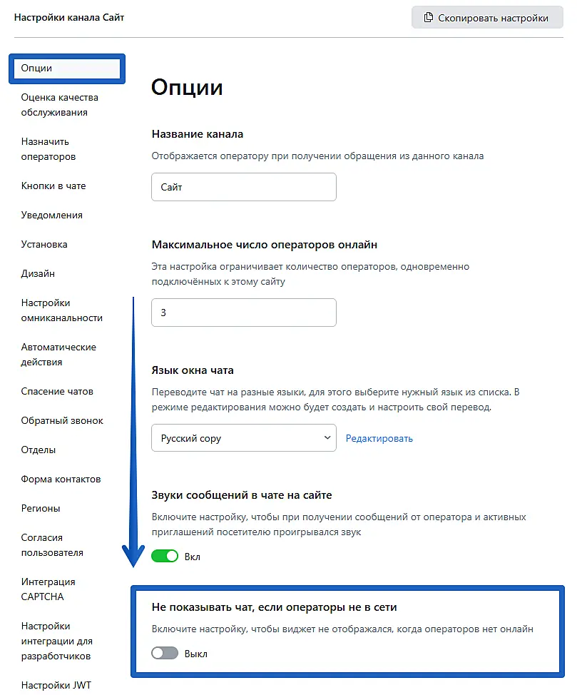 Вам откроется раздел "Опции". Пролистайте страницу ниже до пункта "Не показывать чат, если операторы не в сети". По умолчанию эта функция отключена.