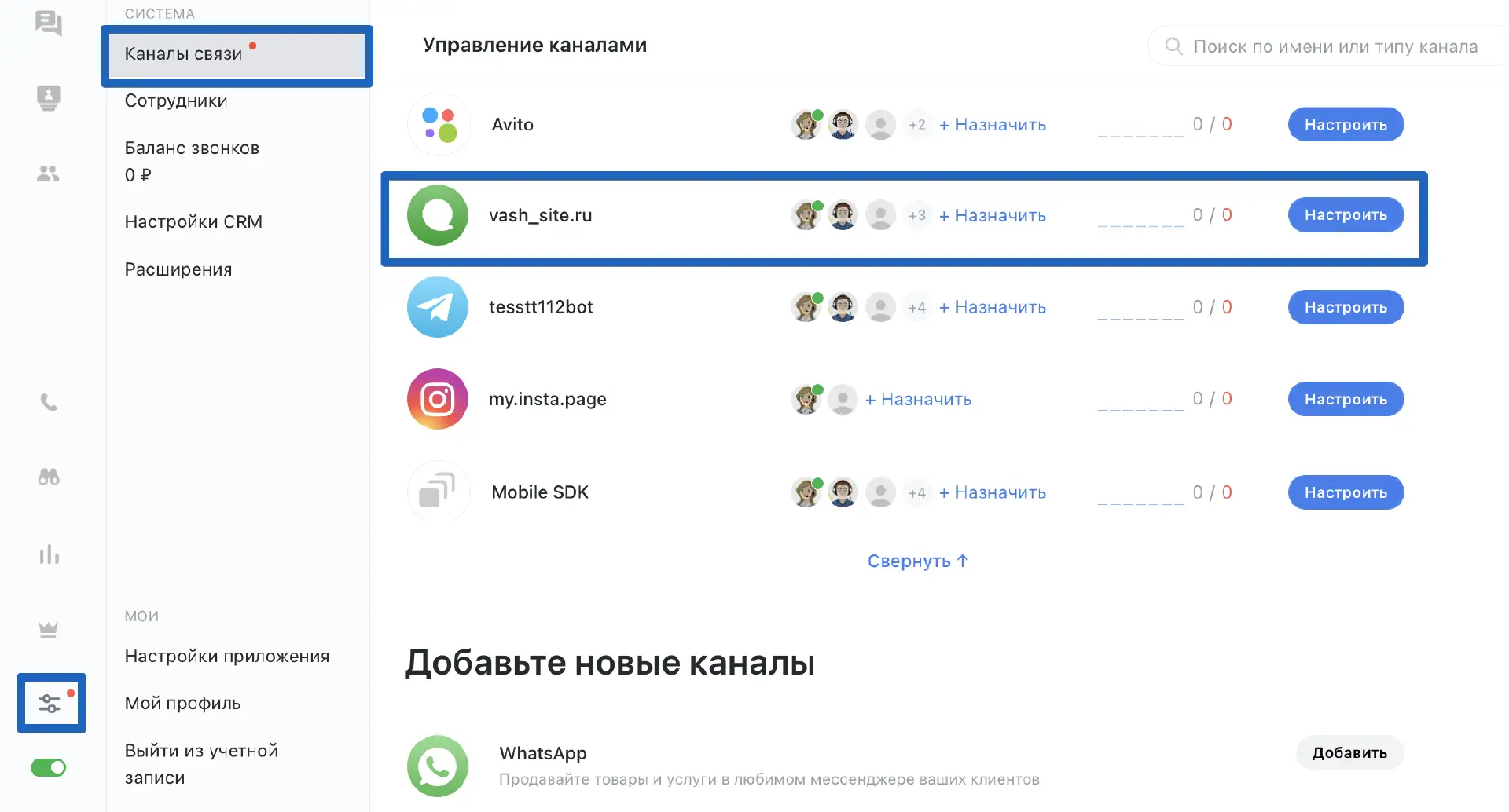Для того, чтобы настроить оценку качества откройте приложение Jivo и перейдите в "Управление" > "Каналы связи" > "Настроить" (рядом с каналом сайта).