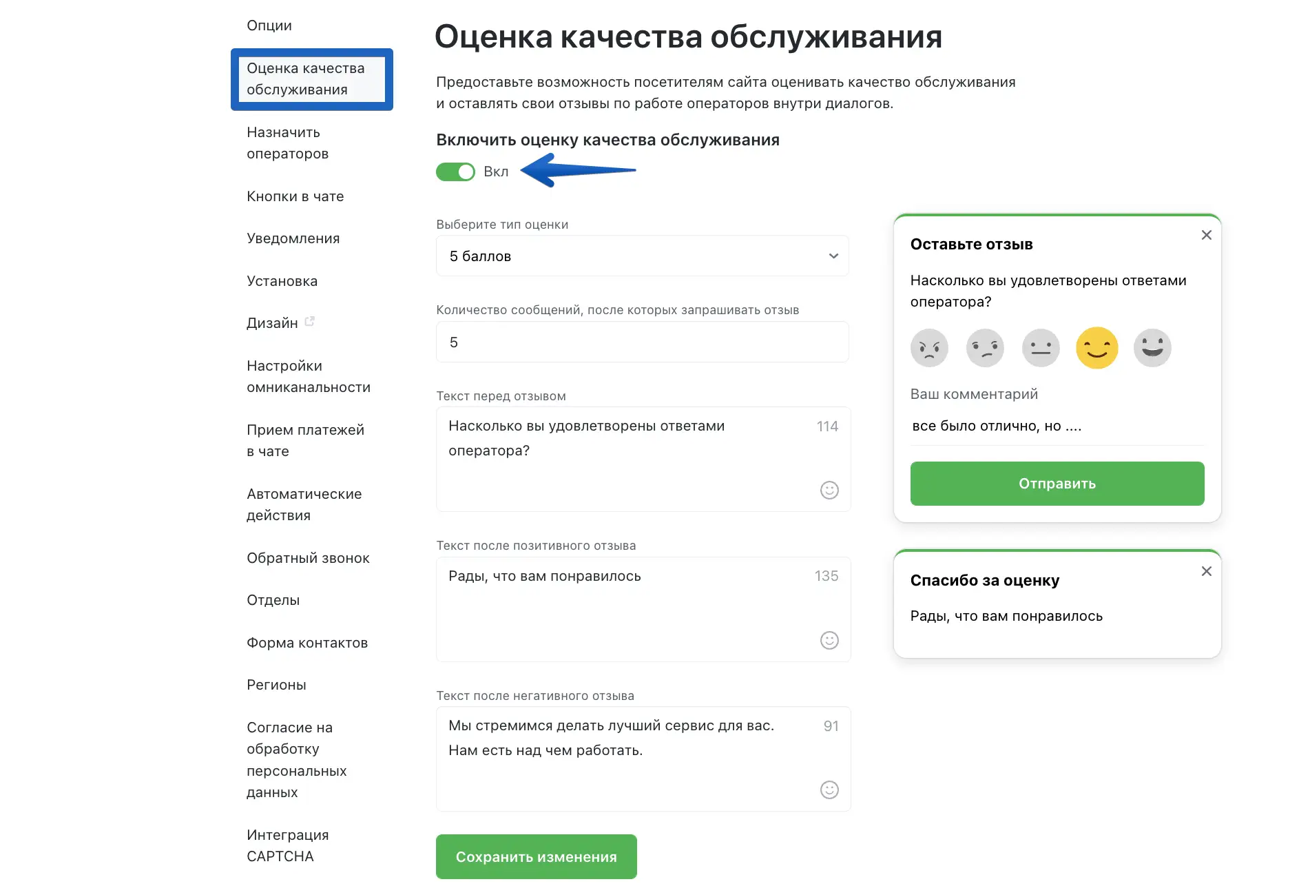Как включить оценку качества обслуживания?