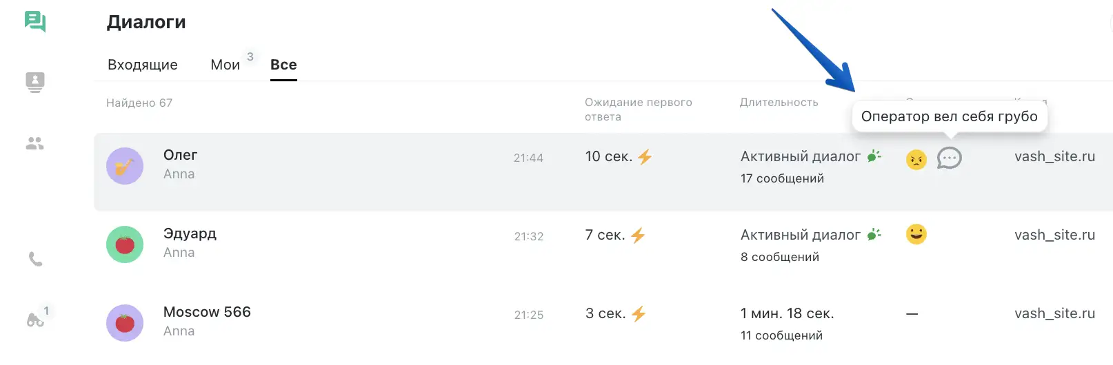 На основании оценок у операторов формируется рейтинг. В разделе "Статистика" > "Сотрудники" можно посмотреть рейтинг операторов за выбранный период.