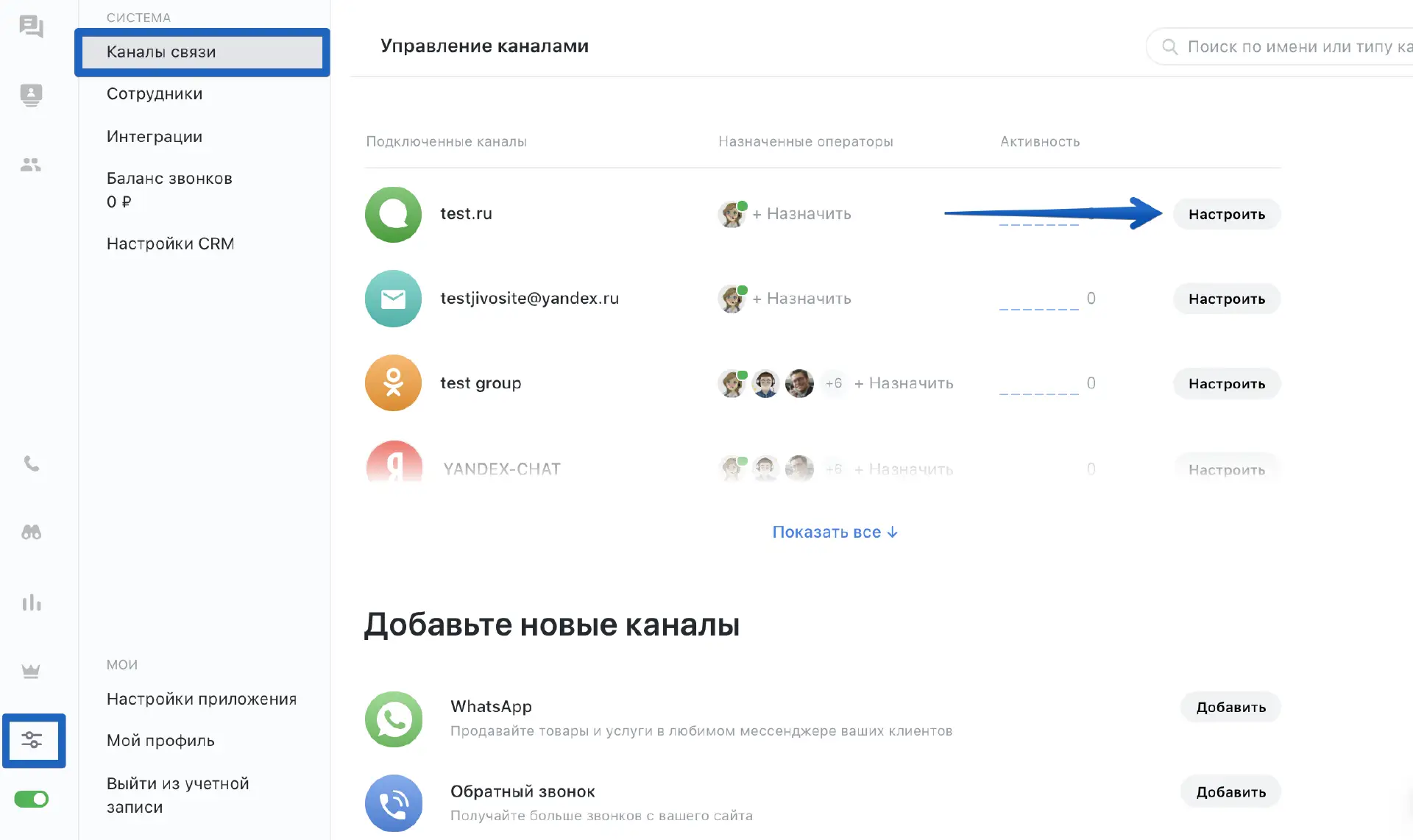 Для изменения дизайна чата на вашем сайте вам потребуется зайти в приложение > Управление > Каналы связи. Среди подключенных каналов найдите канал нужного сайта и нажмите "Настроить".