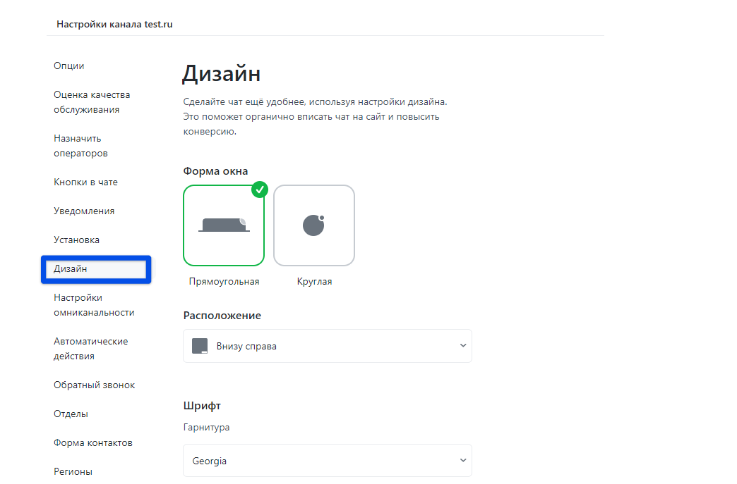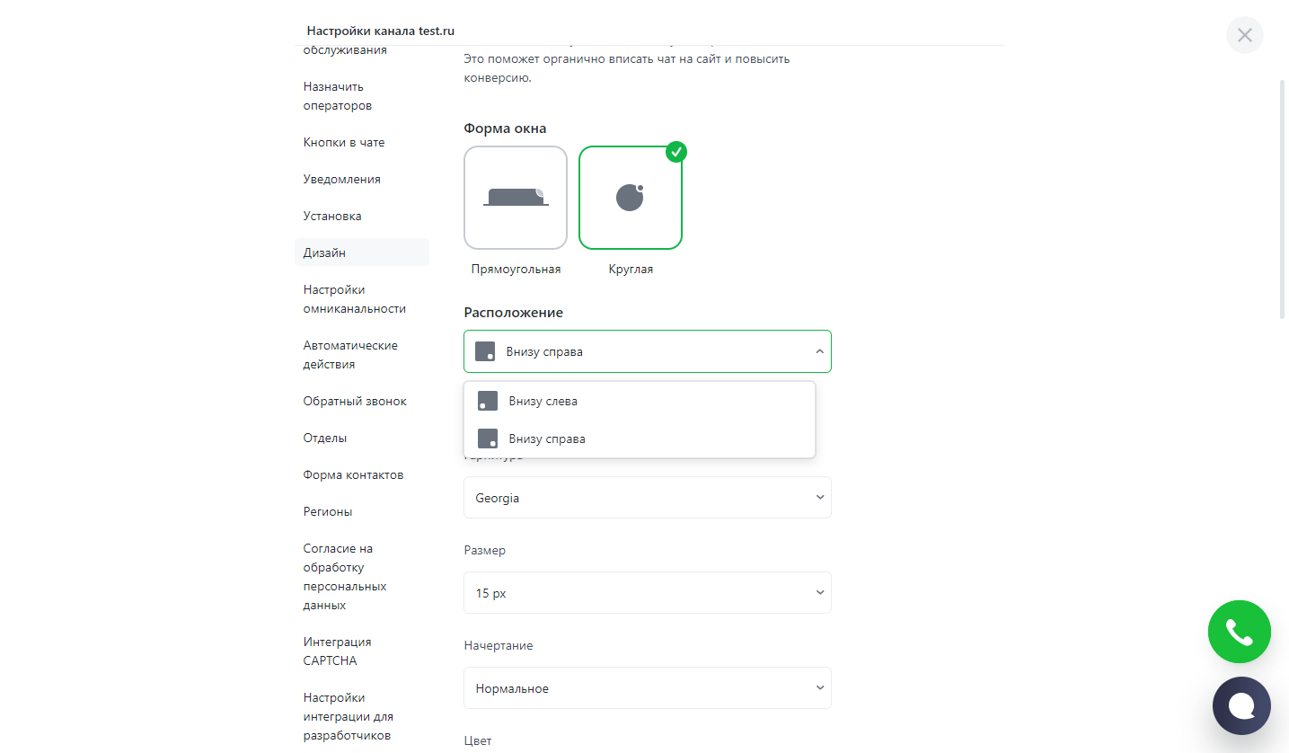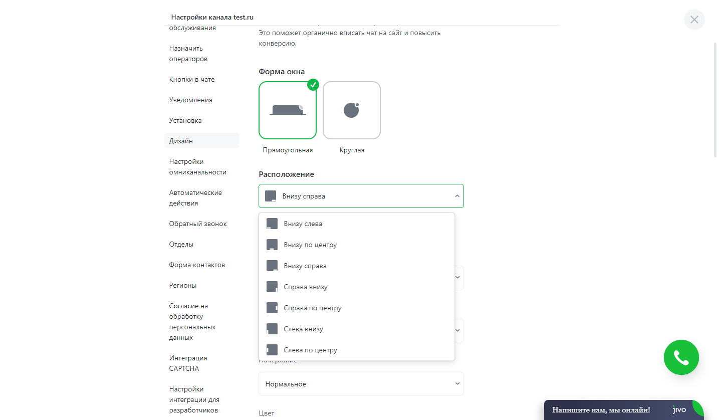 Пожалуй, самая важная из настроек помимо цветовой схемы - положение кнопки и окна чате, а точнее, где именно будет находиться наш сервис на вашем сайте.