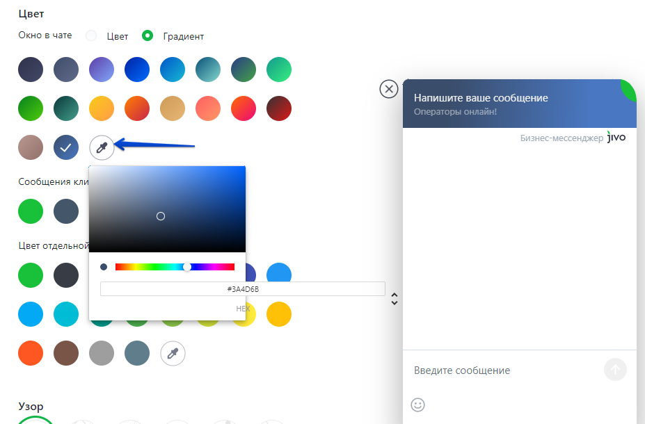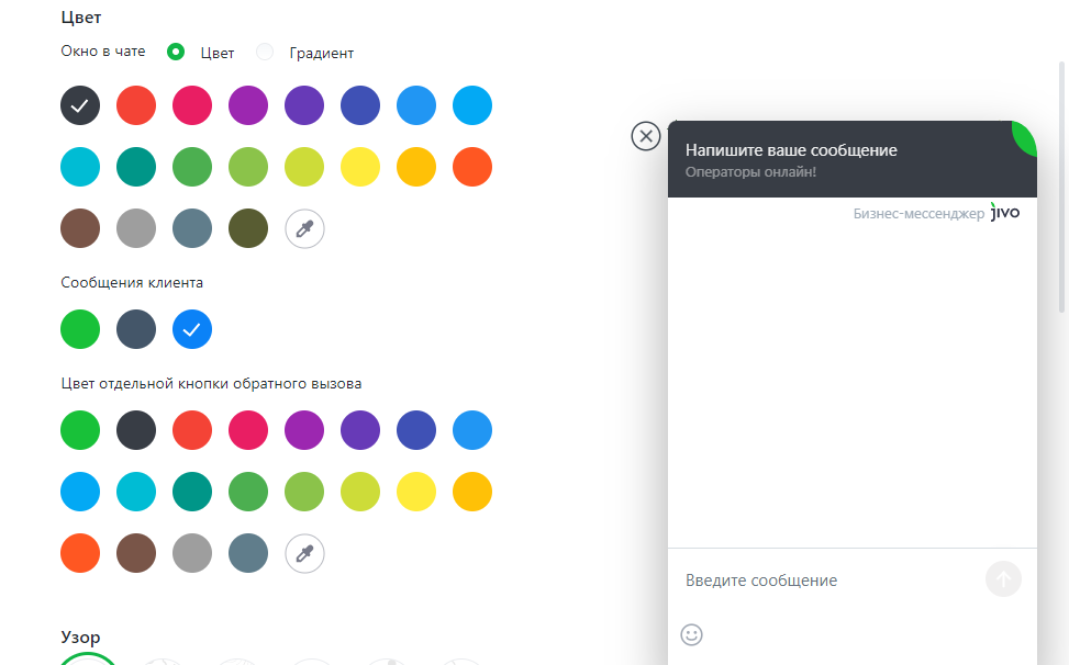В подразделе Цвет вы можете задать цвета для кнопки чата: выбрать цветовую схему из предложенных вариантов или даже настроить свой цвет, нажав на иконку пипетки. Возможно как однотонное оформление ярлыка чата, так и градиент.