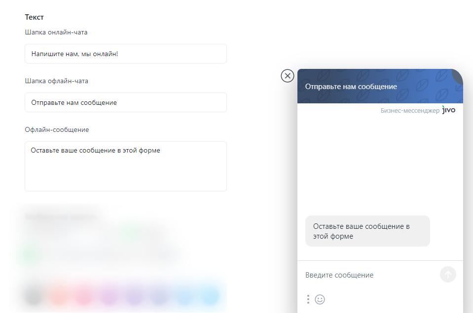 Этот подраздел позволяет изменять текст, который отображается в шапке чата (в онлайн и оффлайн-режиме отдельно), а также текст информационного сообщения в офлайн-чате.
