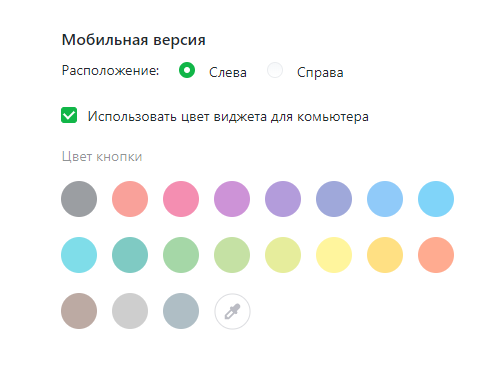 Также есть возможность настроить вид чата на мобильной версии вашего сайта. Вы можете выбрать цвет кнопки чата из предложенных цветов или даже настроить свой цвет. Кроме того, можно выбрать, с какой стороны будет расположена кнопка чата: справа или слева.