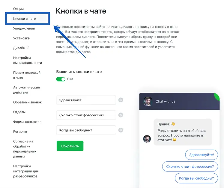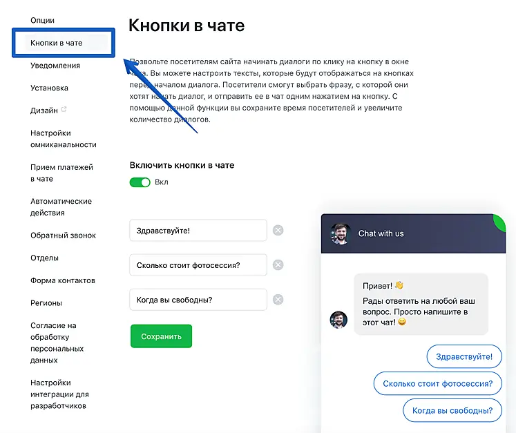 Тут вы можете включить функцию и задать три фразы (каждая до 31 символа), которые появятся в окошке чата, и клиент сможет начать с них диалог. Эти кнопки будут присутствовать в чате как в случае, если сработало активное приглашение, так и при открытии чата вручную по клику на ярлык. Нажатие на кнопку отправит текст с кнопки в чат оператору как сообщение от имени клиента.