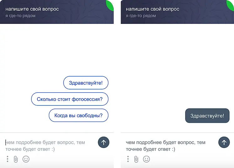 Согласно нашим исследованиям, примерно 50% чатов будет начинаться этими кнопками, поэтому вы можете заранее подготовить быстрые ответы и отвечать клиентам молниеносно. А общее количество диалогов при использовании кнопок вырастает примерно на 20%.