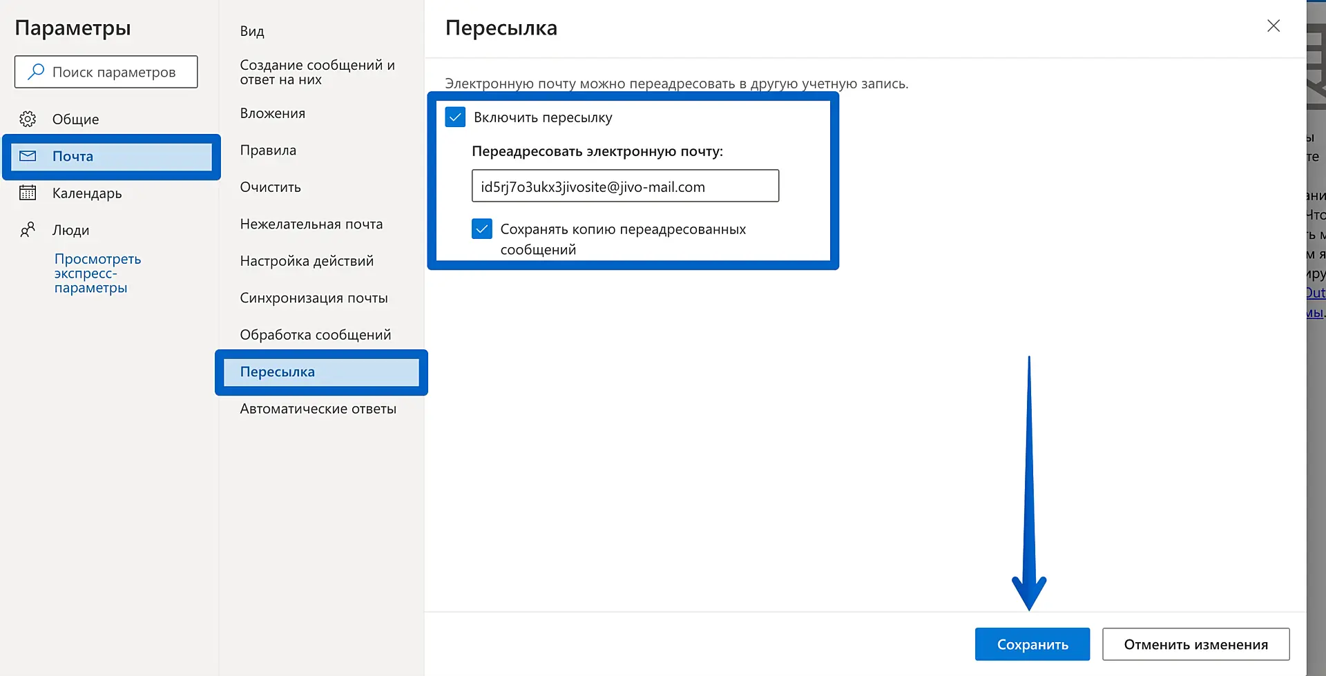 2. В открывшемся окне перейдите в раздел "Почта" > "Пересылка" и нажмите "Включить пересылку", введите адрес для пересылки писем в Jivo и нажмите кнопку "Сохранить"