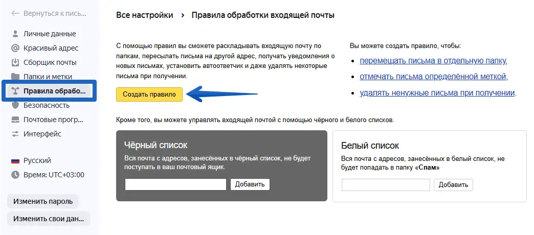Нажмите "Создать правило". Может потребоваться ввести пароль от Яндекс для подтверждения.