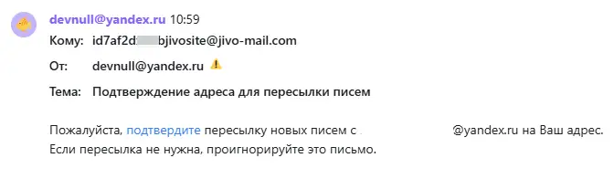 После этого в приложении Jivo вы получите новое обращение от Яндекс по каналу Email. В письме будет содержаться ссылка для подтверждения пересылки. Кликните на нее, чтобы завершить настройку.