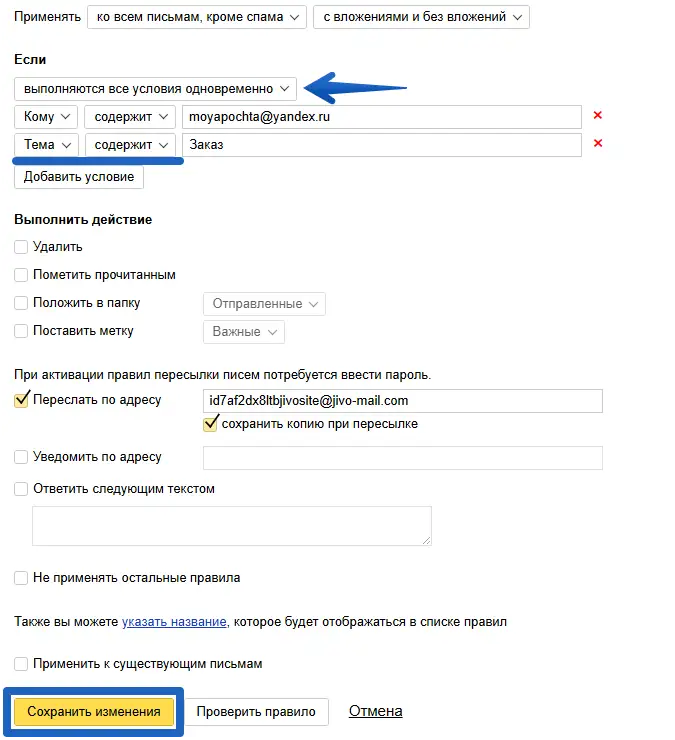 Важно: Чтобы при пересылке соблюдались оба условия, выберите правило "Выполняются все условия одновременно" в начале блока "Если".
