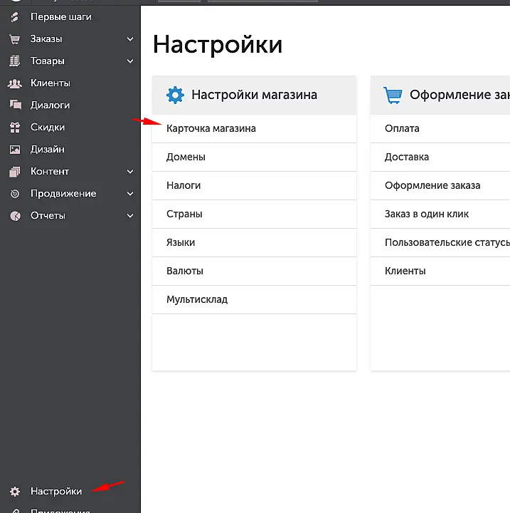 - В панели управления вашего магазина InSales перейдите в раздел "Настройки", который находится в левом нижнем углу, затем в раздел "Карточка магазина".