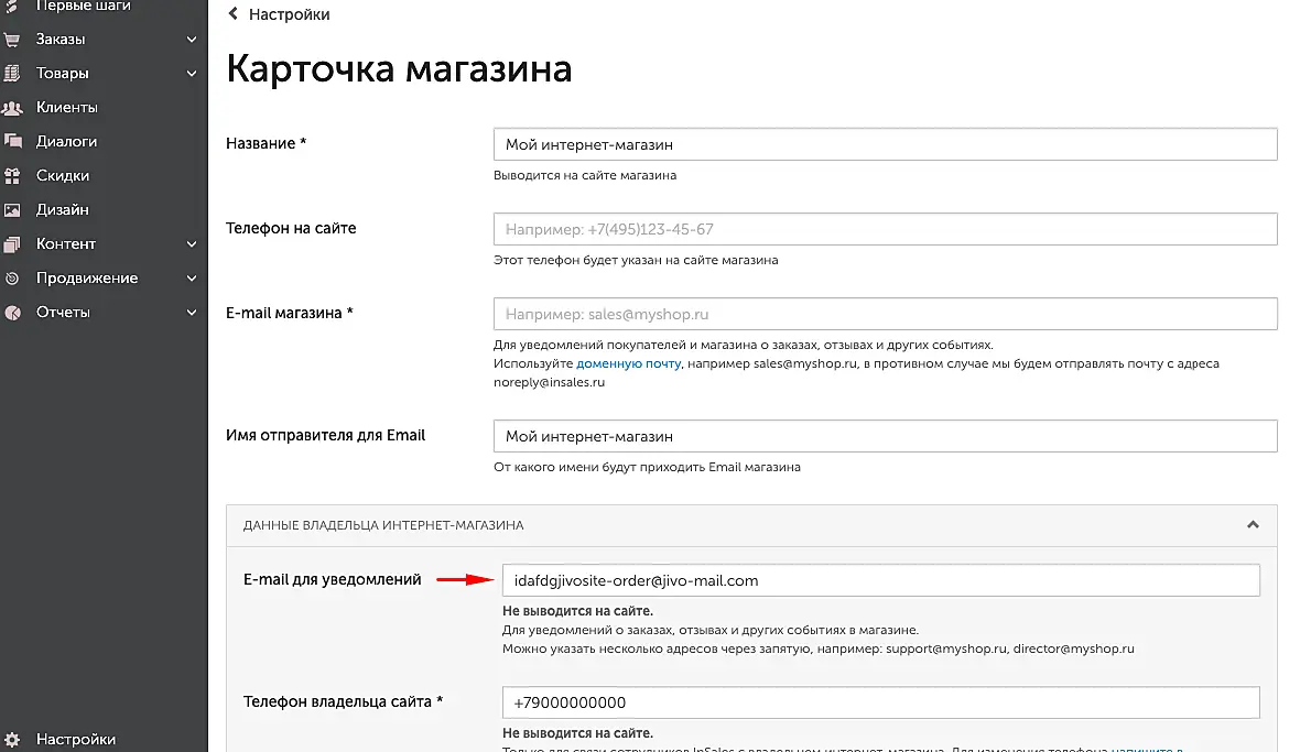- Найдите поле "E-mail для уведомлений" в блоке "Данные владельца интернет-магазина" и скопируйте в него почту из Jivo. Обратите внимание, что адресов в этом поле можно добавить несколько, через запятую.