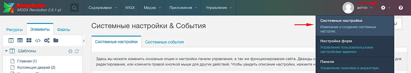 1. В панели администрирования MODX перейдите в раздел "Системные настройки" в правом верхнем углу.