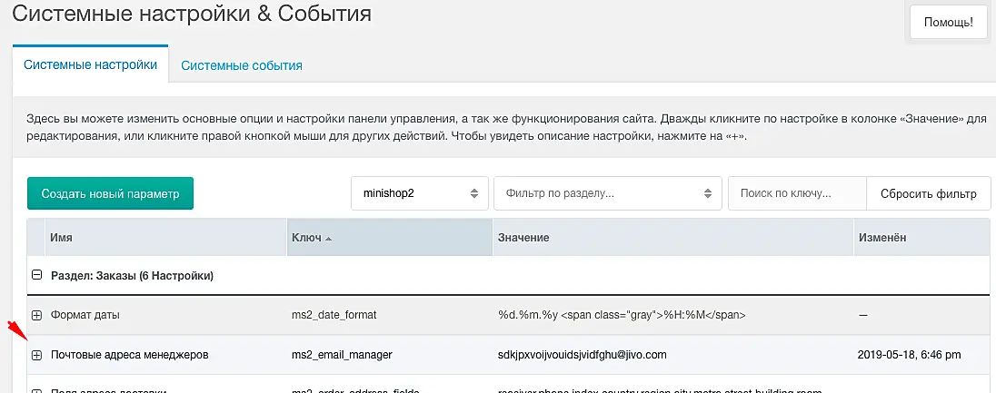 2. Перейдите в раздел настроек minishop2 и добавьте почту из настроек канала "Заказы с сайта" в Jivo в настройку "Почтовые адреса менеджеров" (ms2_email_manager). Обратите внимание, что адресов в этом поле может быть несколько, через запятую.
