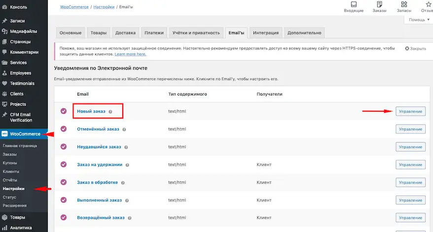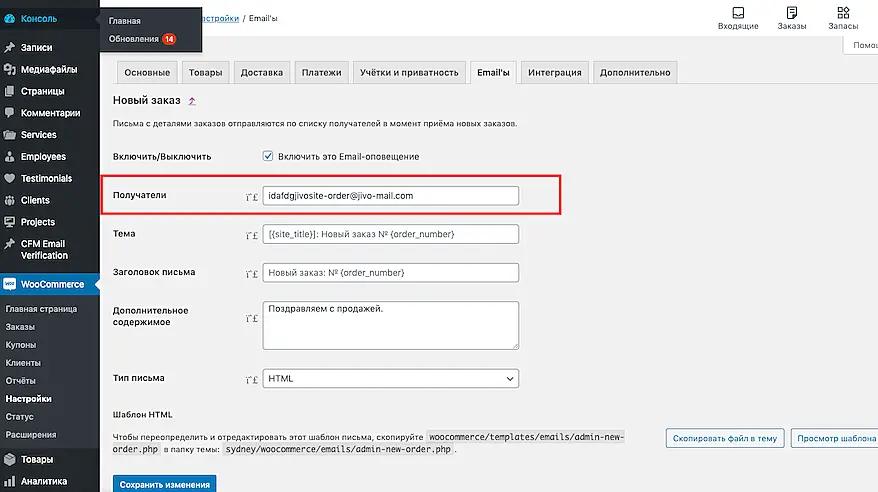 1. Зайдите в раздел Woocommerce, затем в Настройки. Необходимо добавить почту Jivo в получатели уведомления о новом заказе, для этого отредактируйте настройки соответствующего уведомления: