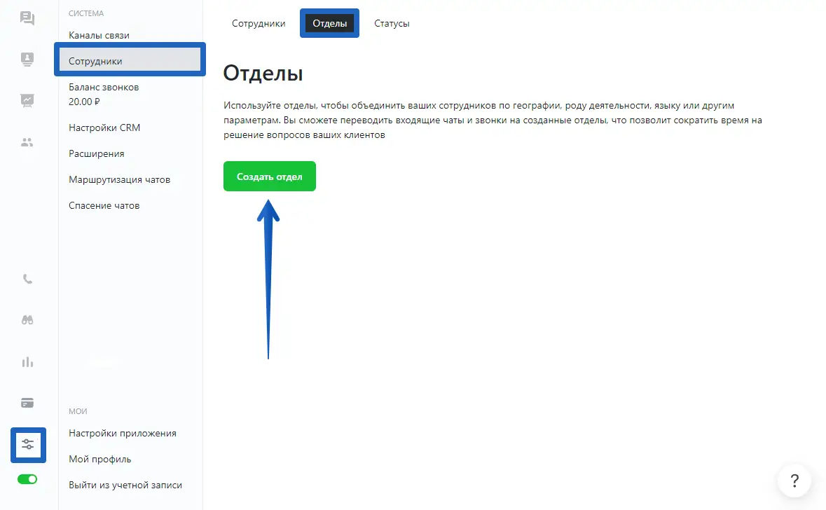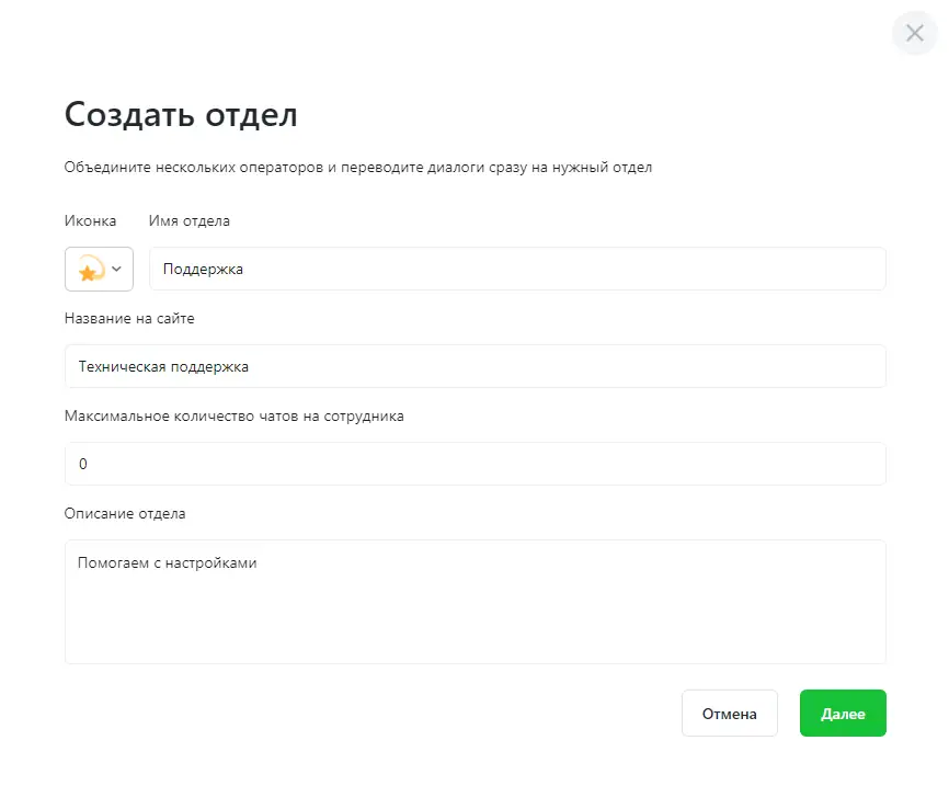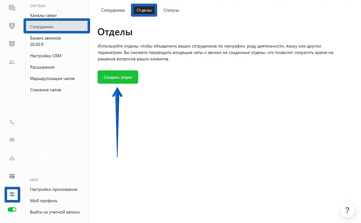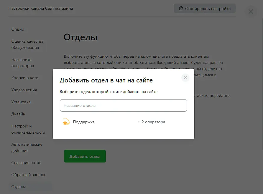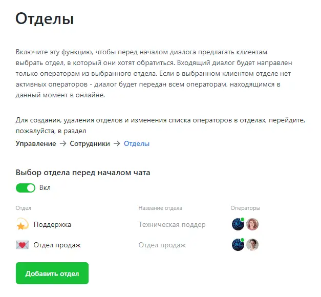 Один и тот же оператор может быть прикреплен сразу к нескольким отделам. Также вы сможете в любой момент настроить отделы в разделе "Управление" > "Сотрудники" > "Отделы".