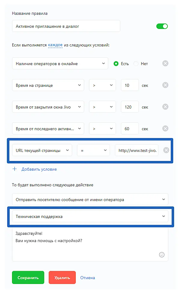 Перейдите в раздел "Автоматические действия" и создайте новое действие для страницы, где должно появляться сообщение от технической поддержки. В настройках условий выберите "URL текущей страницы" и укажите нужный адрес.