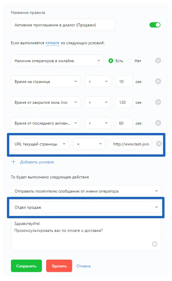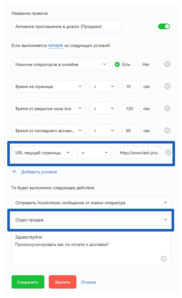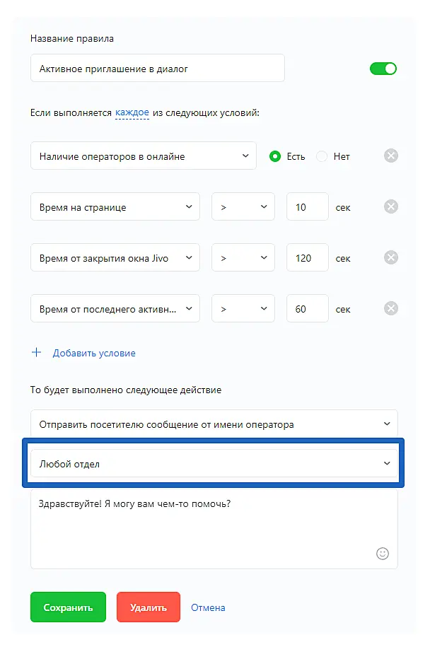 Обратите внимание: Настройка отдела доступна только для действия: "Отправить посетителю сообщение от имени оператора".