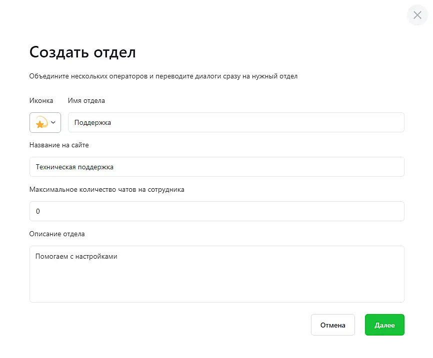 После этого откроется окно создания отдела. Выберите иконку и укажите имя отдела. Они будут отображаться сотрудникам в приложении Jivo. Посетители на сайте этого не увидят.
