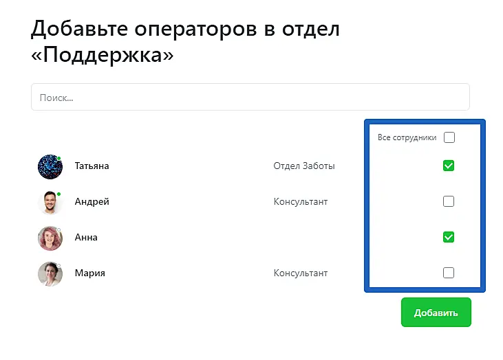 Отметьте галочками операторов, которые будут входить в данный отдел. Вы можете добавить в отдел сразу всех сотрудников, нажав соответствующую кнопку.