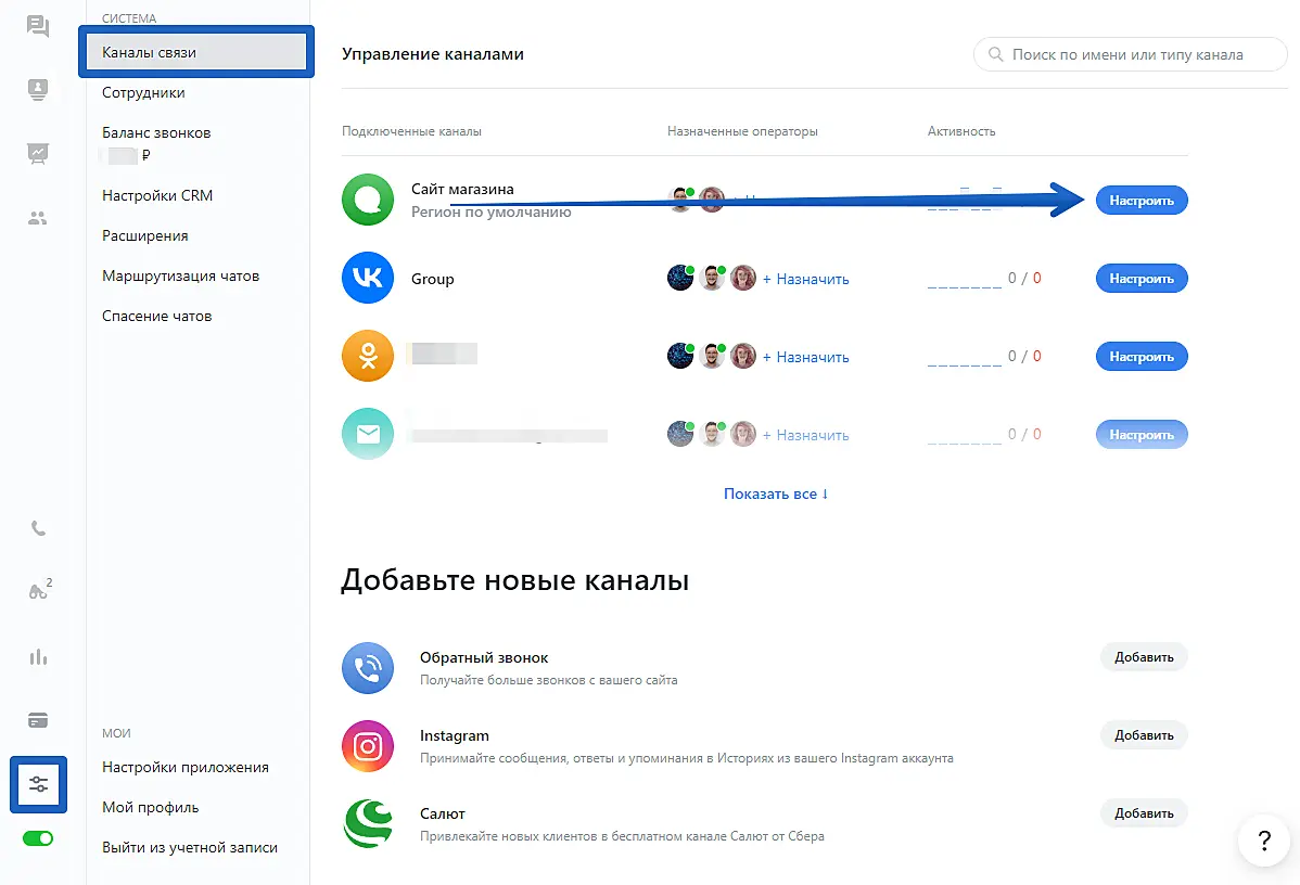 Второй этап настройки — подключить созданные отделы к вашему сайту. Для этого перейдите в "Управление" > "Каналы связи" > "Настроить" (рядом с каналом сайта).