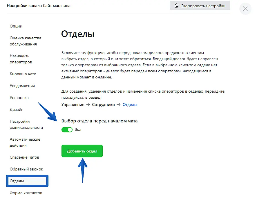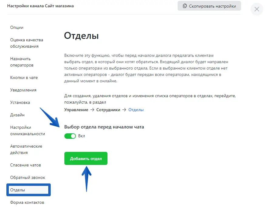 Затем перейдите в раздел "Отделы" и включите "Выбор отдела перед началом чата".