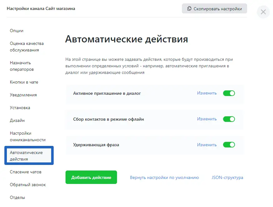 Настройка активных приглашений по отделам осуществляется в разделе "Управление" > "Каналы связи" > "Настроить" > "Автоматические действия".