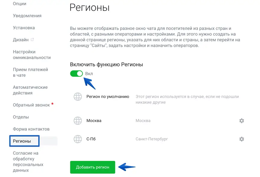 Для каждого региона можно произвести индивидуальные настройки окна чата (дизайн, надписи, активные приглашения и прочее) и отслеживать статистику отдельно от других регионов.