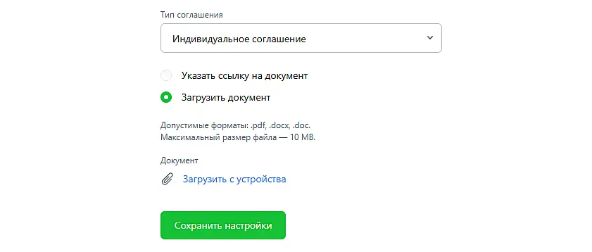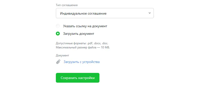 Вы можете указать либо ссылку на документ с соглашением, либо загрузить его с вашего ПК, нажав "Загрузить с устройства".