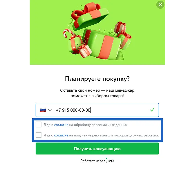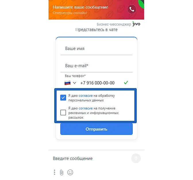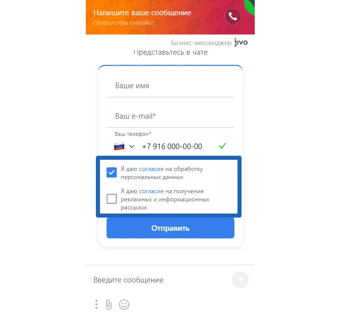 Вы можете дополнить форму контактов в виджете Jivo чек-боксами с разрешением на обработку персональных данных и получение информационных и рекламных рассылок. В инструкции ниже расскажем, как это настроить.