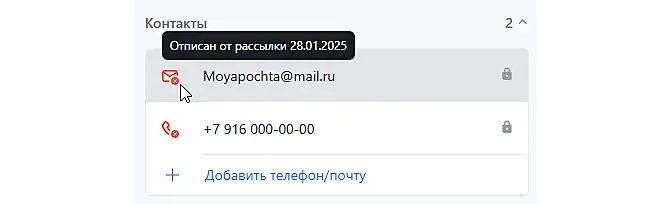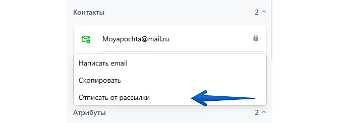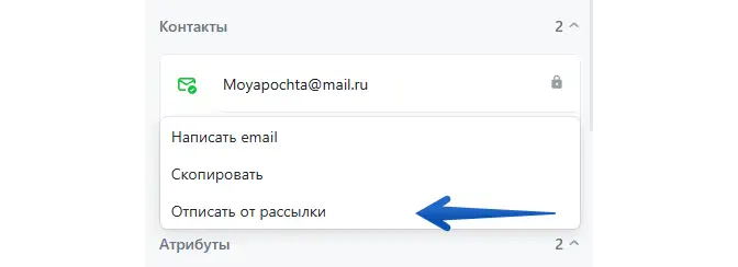 Если клиент больше не хочет получать рассылки от вашей компании, оператор может отметить это в информационной панели диалога. Для этого нужно кликнуть на поле с контактом посетителя и выбрать "Отписать от рассылки":