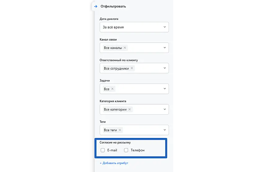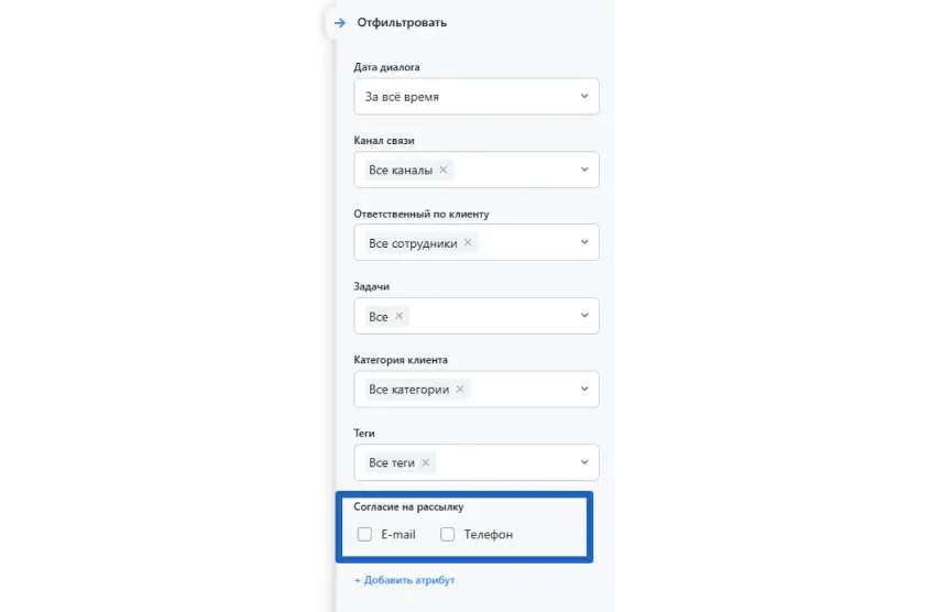 В разделе "CRM" > "Клиенты" вы сможете отфильтровать клиентов, которые дали свое согласие на рассылки по Email и / или по телефону: