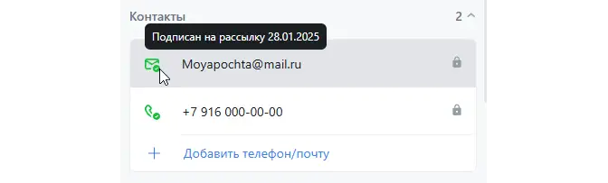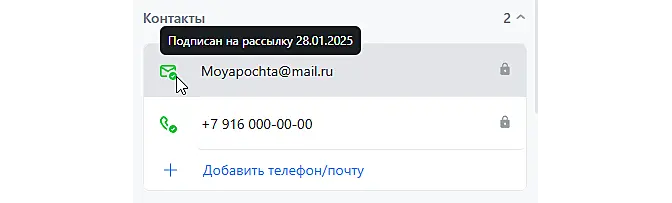 Если клиент дал свое согласие на получение рассылок, в приложении Jivo оператор также сможет это увидеть. В окне диалога, в разделе "Контакты" данные пользователя будут с зелеными иконками. При наведении можно будет узнать, когда именно клиент дал свое согласие:
