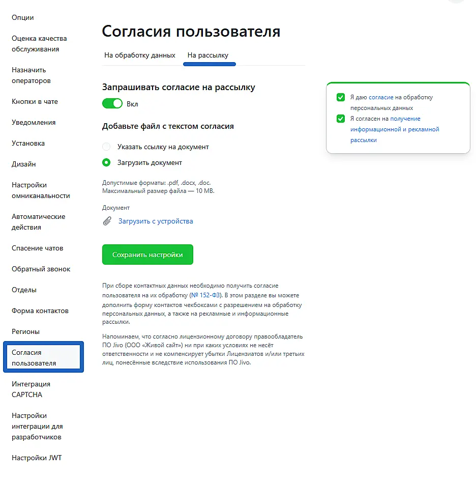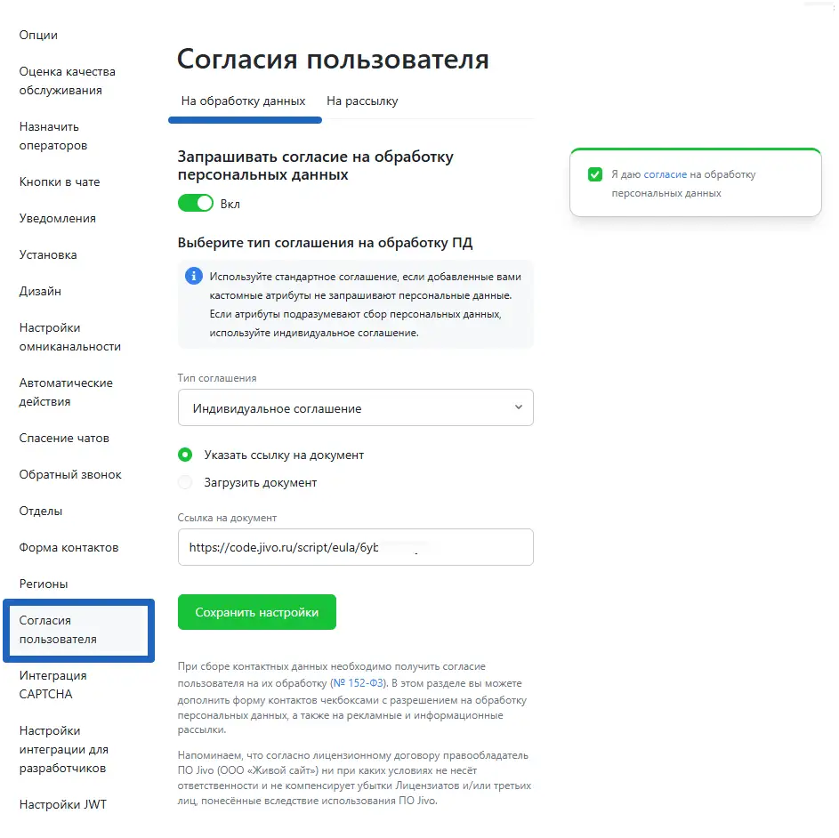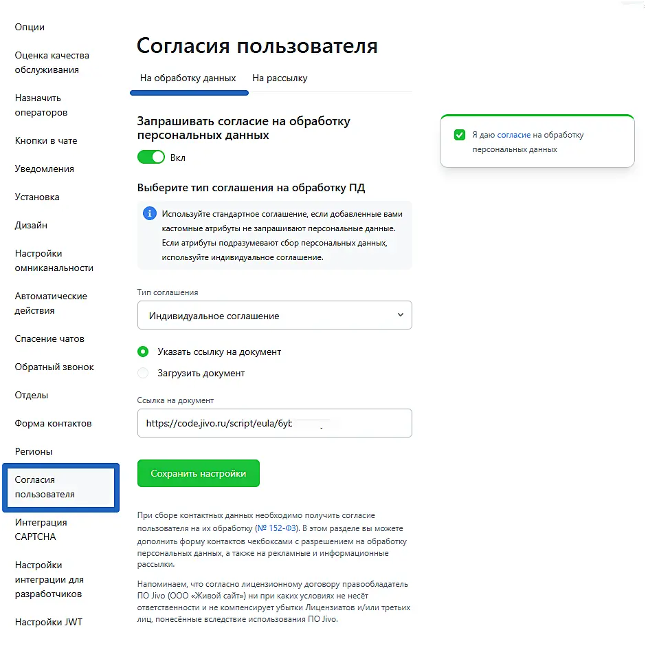 Если у вас уже есть готовое соглашение на обработку персональных данных, вы можете загрузить его в приложении Jivo или указать ссылку на документ / страницу, где расположена ваша версия согласия на обработку ПД.