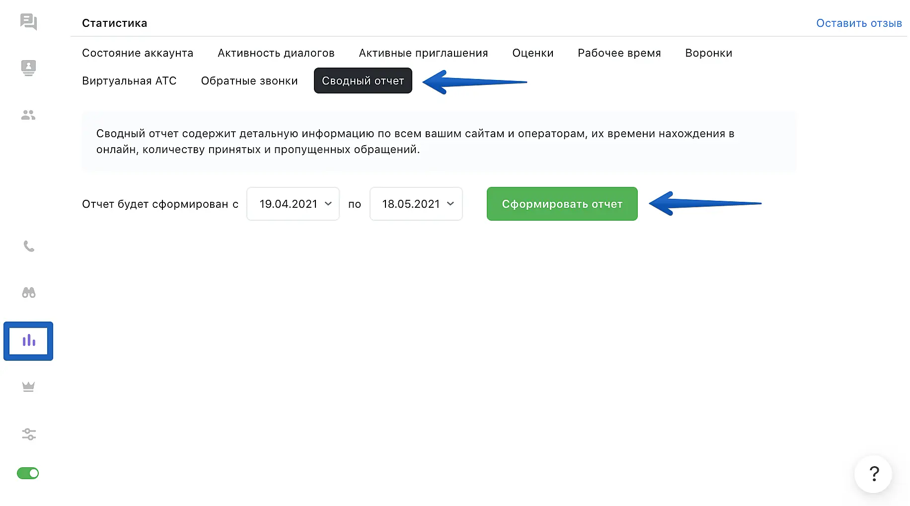 Для этого перейдите в приложение Jivo и откройте раздел "Управление" - подраздел "Статистика". Перейдите на вкладку "Сводный отчет" и выберите, за какой срок будете запрашивать отчет. Далее нажмите «Сформировать отчет» и выберите тип файла.