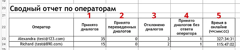 4. Принято диалогов без ответа оператора - диалоги в которых оператор нажал «Ответ», но так и не написал сообщения до ухода клиента с сайта;