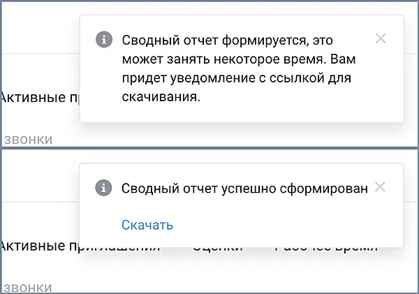 После этого вы получите уведомление, что начато формирование отчета. Это занимает некоторое время, и вы можете переходить в другие разделы приложения. Как только файл будет готов для скачивания, вы получите новое уведомление в правом верхнем углу приложения. Нажмите на ссылку в уведомлении, чтобы скачать документ.