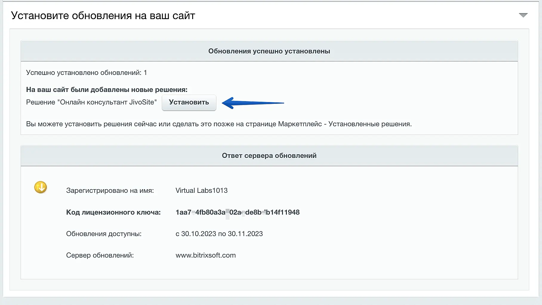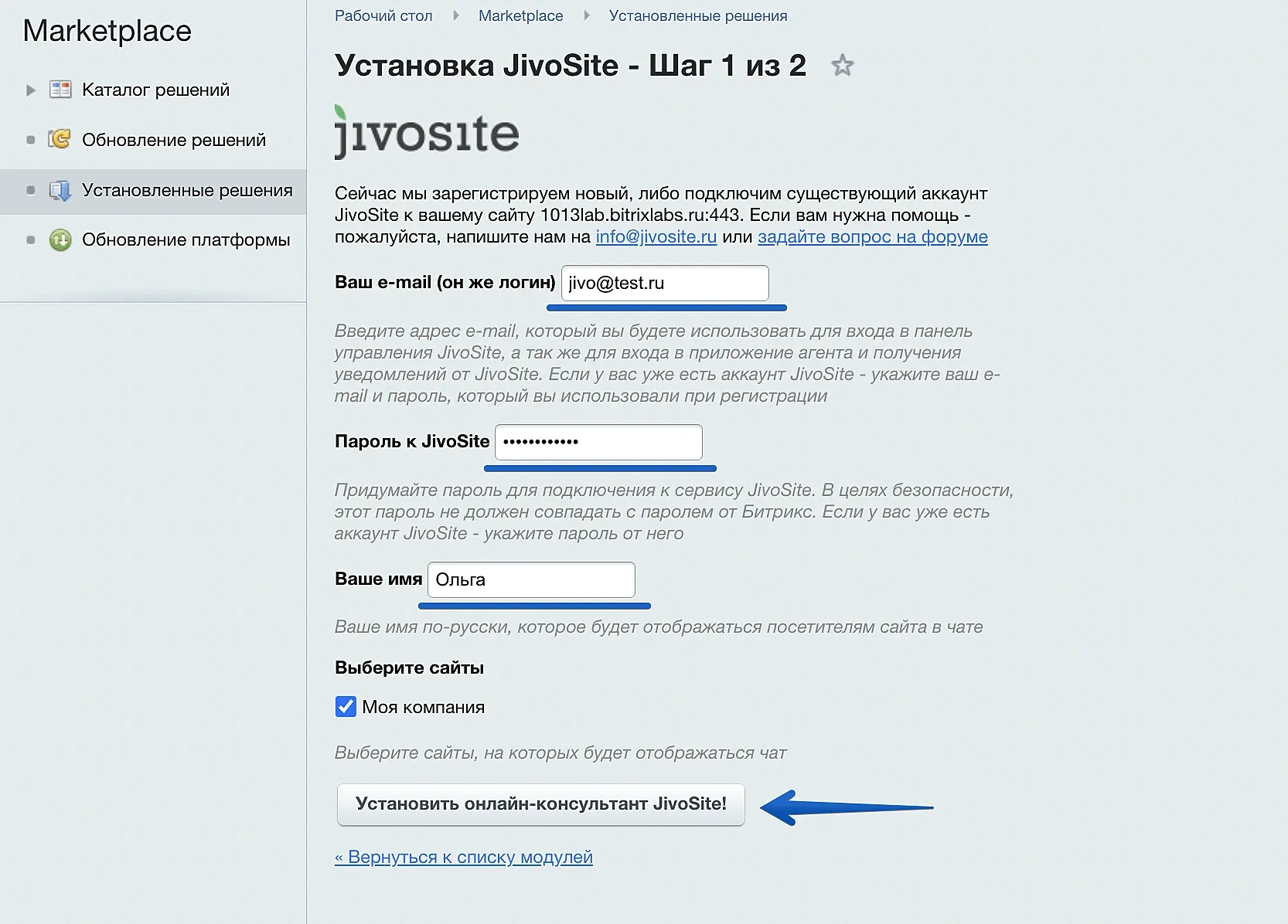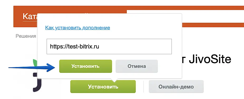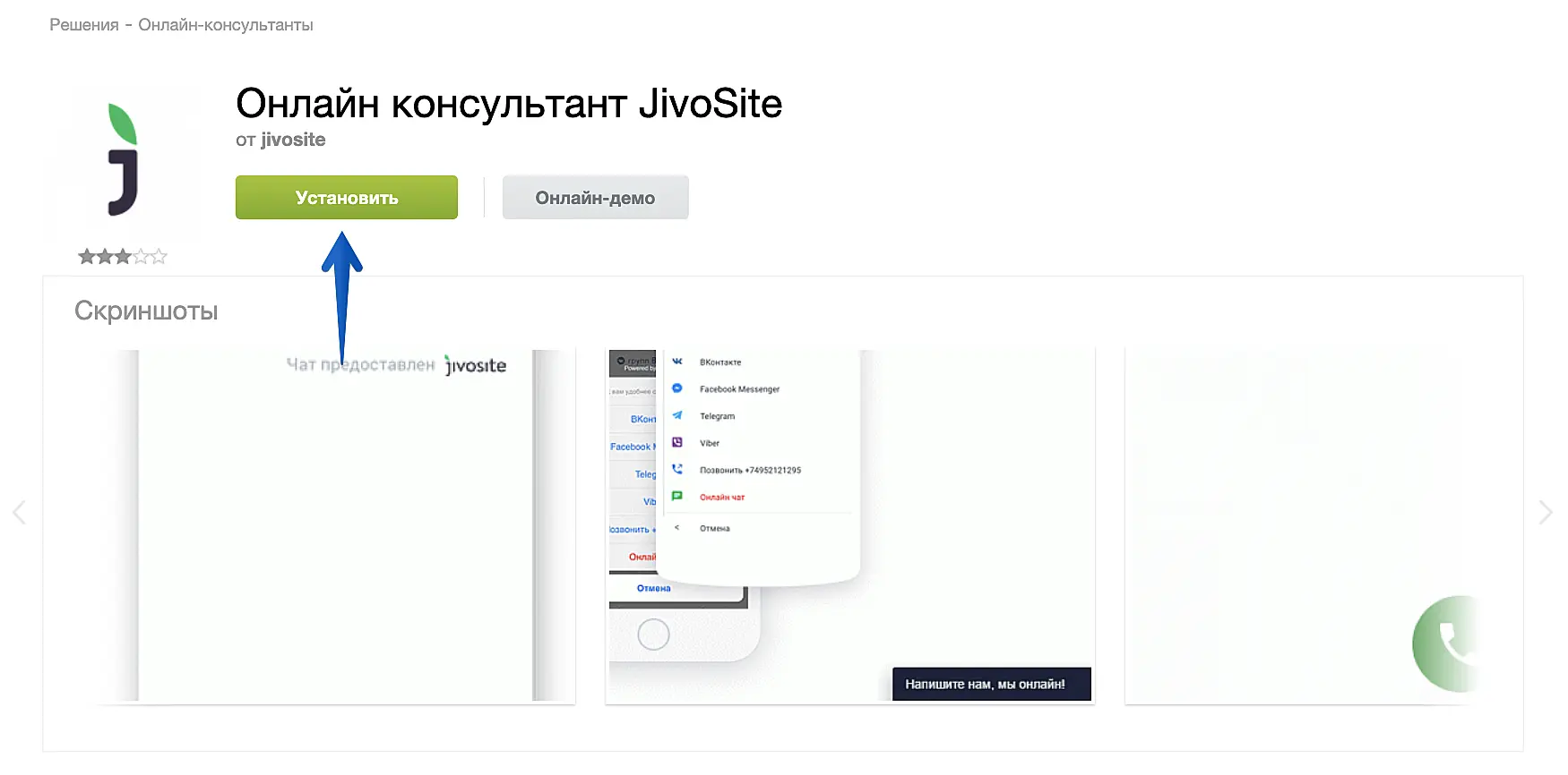 Перейдите на страницу модуля "Онлайн консультант JivoSite" в маркетплейсе 1C-Битрикс и нажмите "Установить".