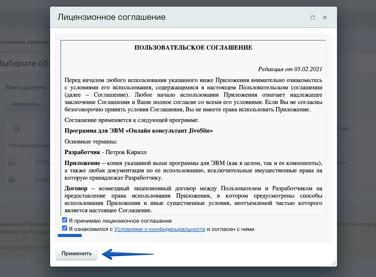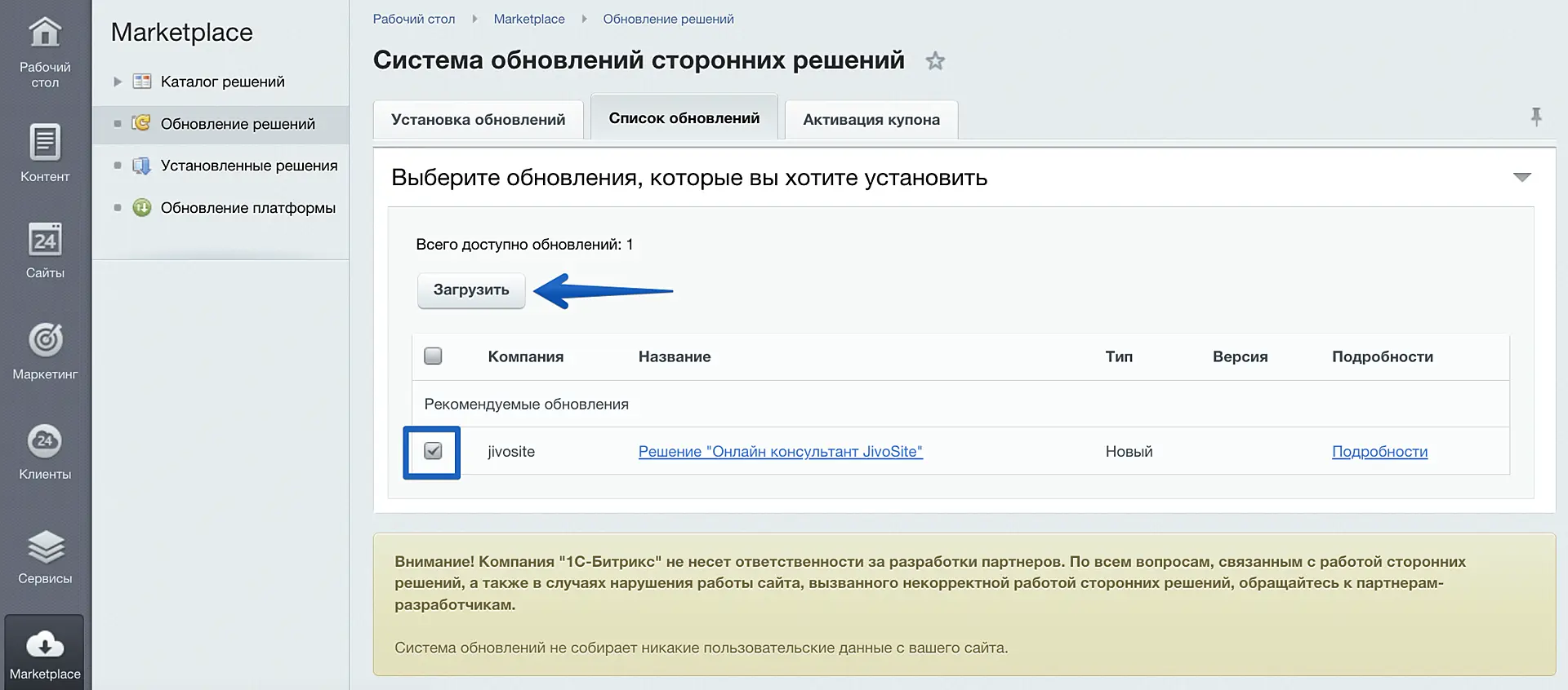 В панели "Администрирование" откроется вкладка "Marketplace": выберите галочкой jivosite и нажмите "Загрузить".