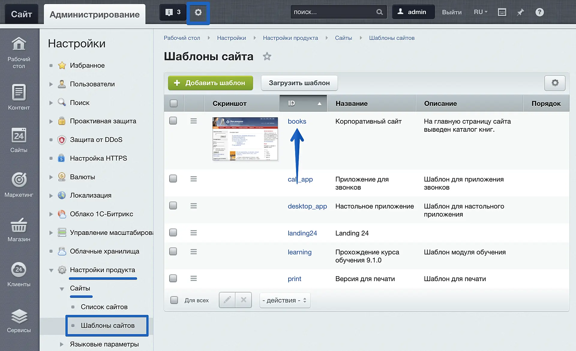 В панели "Администрирование" в 1С-Битрикс перейдите в "Настройки" > "Настройки продукта" > "Сайты" > "Шаблоны сайтов". Выберите ваш шаблон.