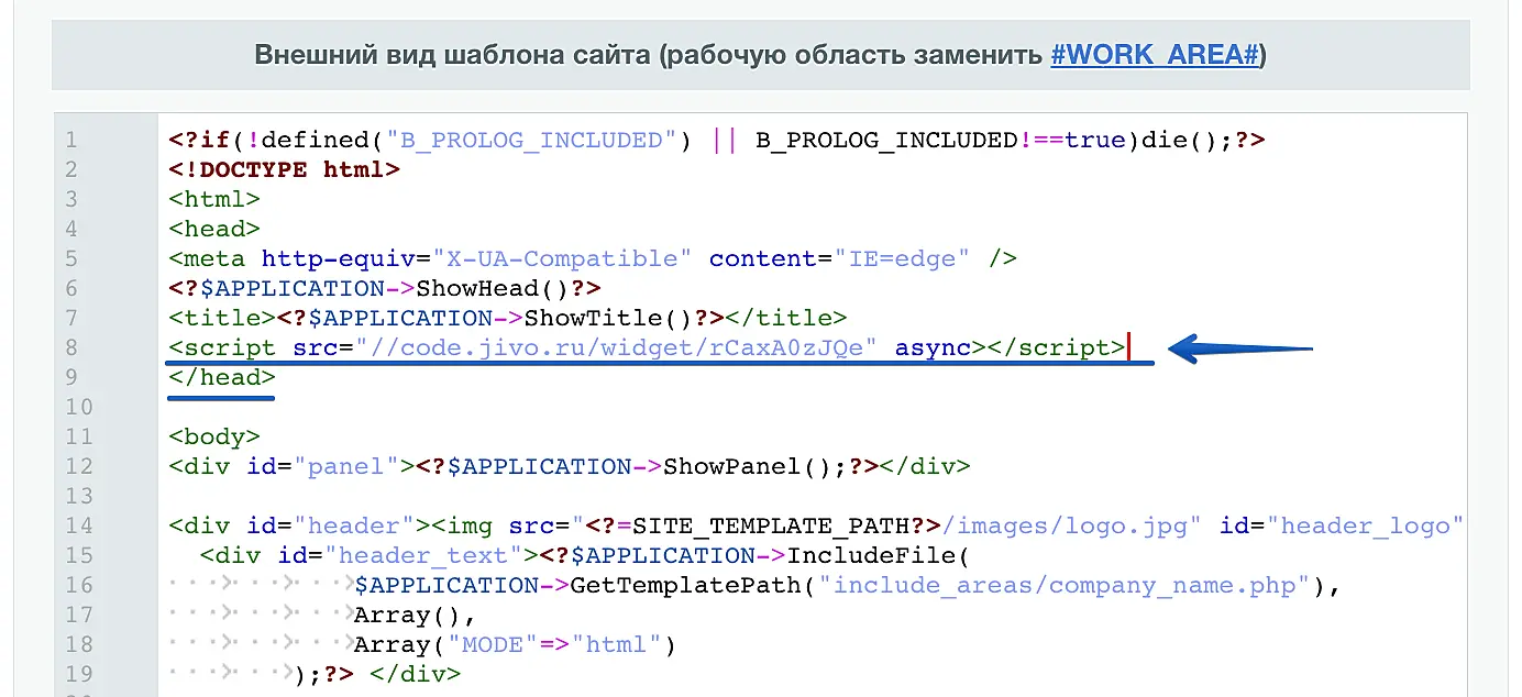 Откроется HTML-шаблон. Найдите закрывающий тег <\ head> и вставьте код, скопированный в Jivo, в строке над ним.