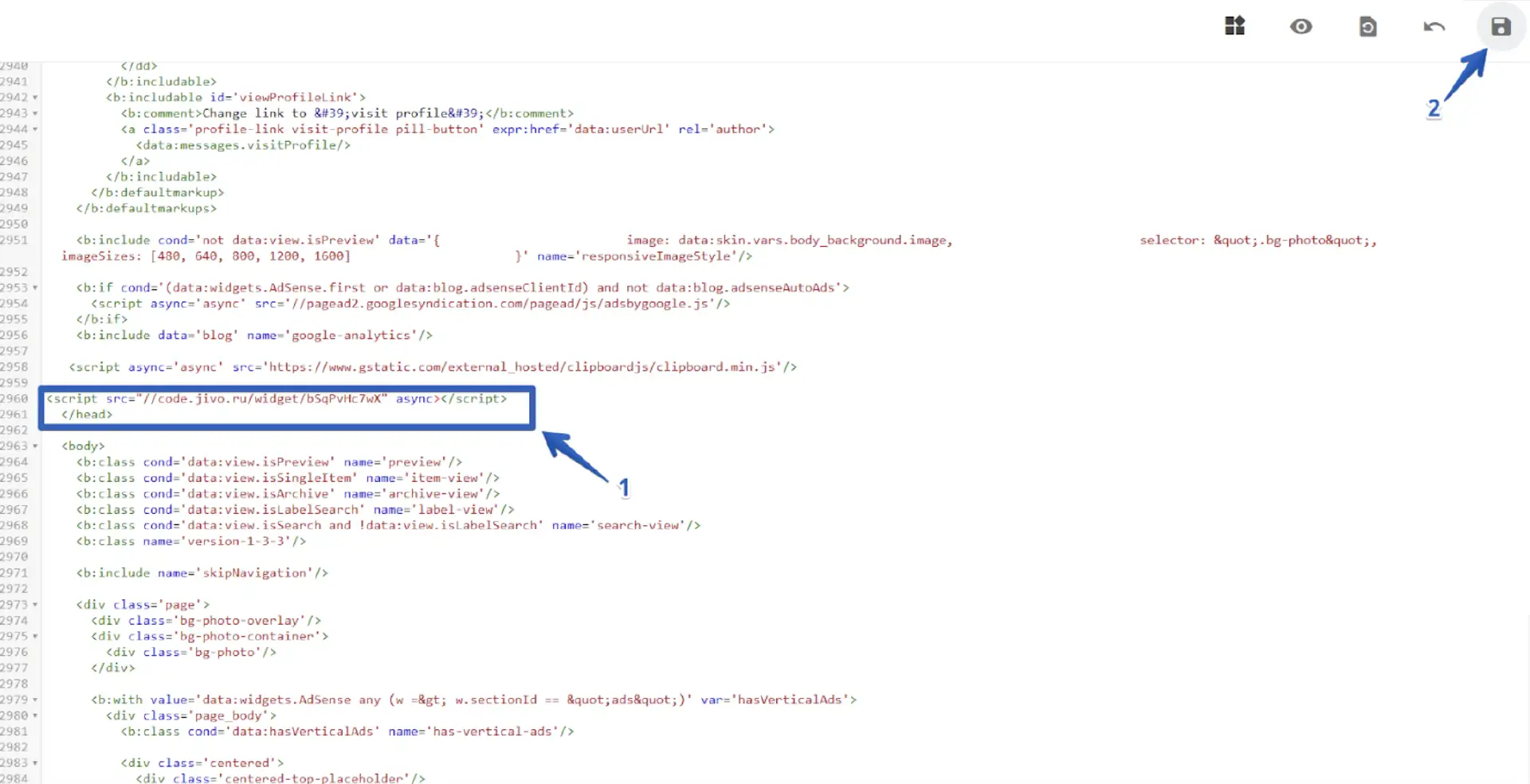 и вставьте скопированный из Jivo код прямо перед ним, а далее нажмите Сохранить.