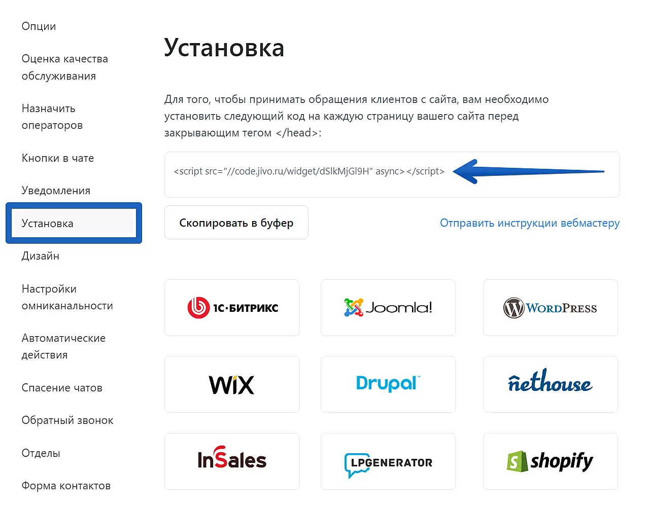 Установка таким способом позволяет добавить виджет чата на отдельные страницы вашего сайта.